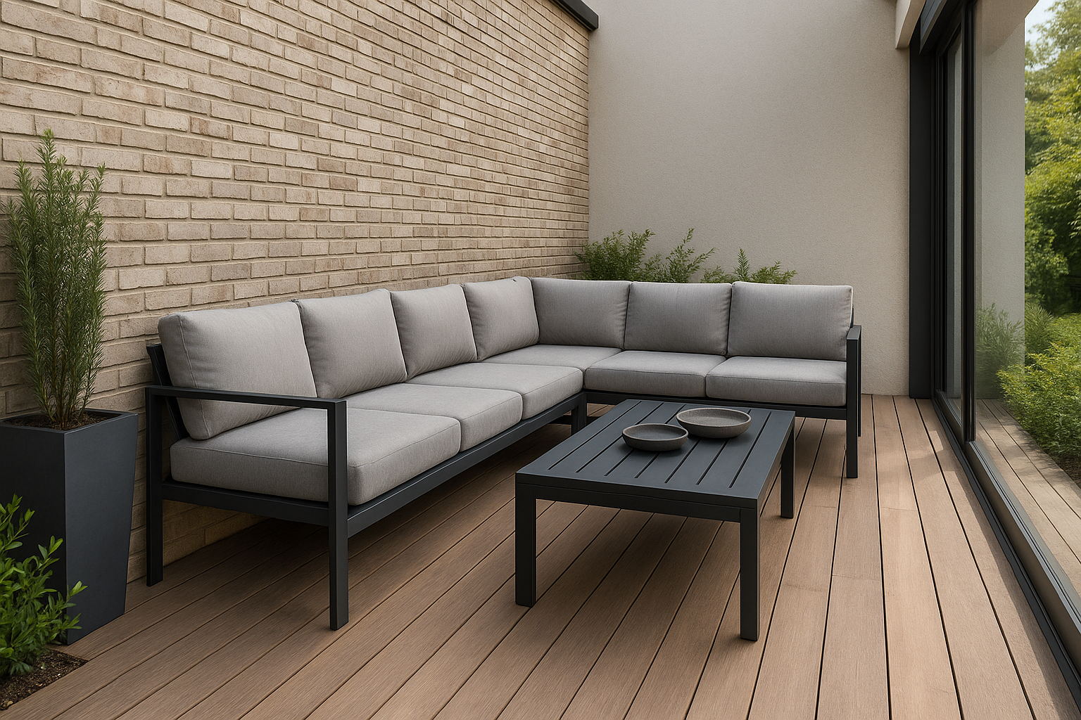 Największym wyzwaniem w wąskich przestrzeniach jest optyczne przytłoczenie meblami. Dlatego narożnik powinien mieć lekką linię — cienkie profile aluminiowe, minimalistyczne oparcia i stonowaną kolorystykę. Dzięki temu mebel nie dominuje nad przestrzenią, a taras wydaje się szerszy, bardziej otwarty.